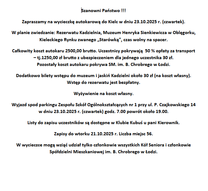 Szanowni Państwo !!! Zapraszamy na wycieczkę autokarową do Kielc w dniu 23.10.2025 r. (czwartek).