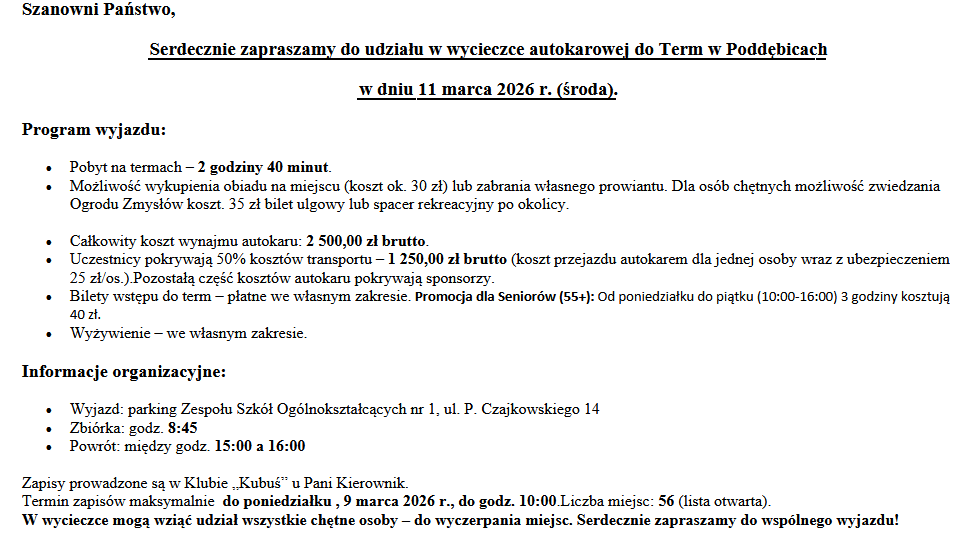 Serdecznie zapraszamy do udziału w wycieczce autokarowej do Term w Poddębicach w dniu 11 marca 2026 r. (środa).